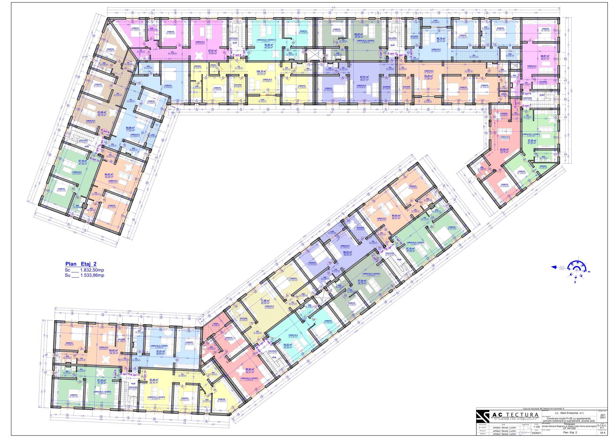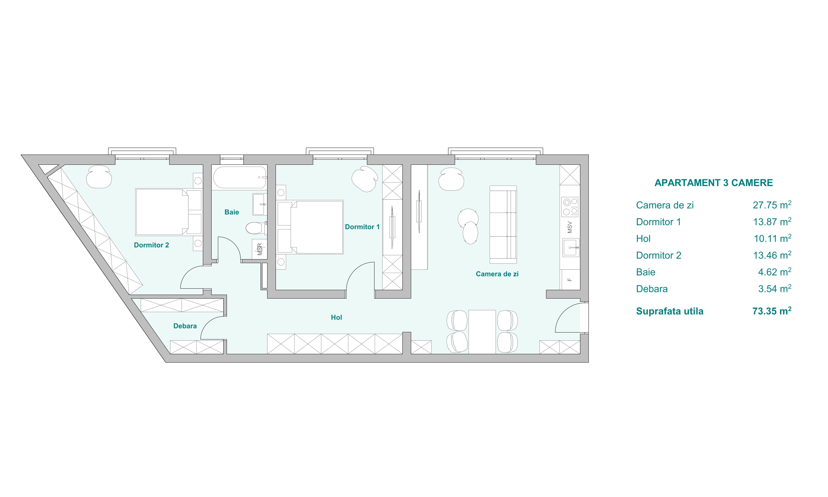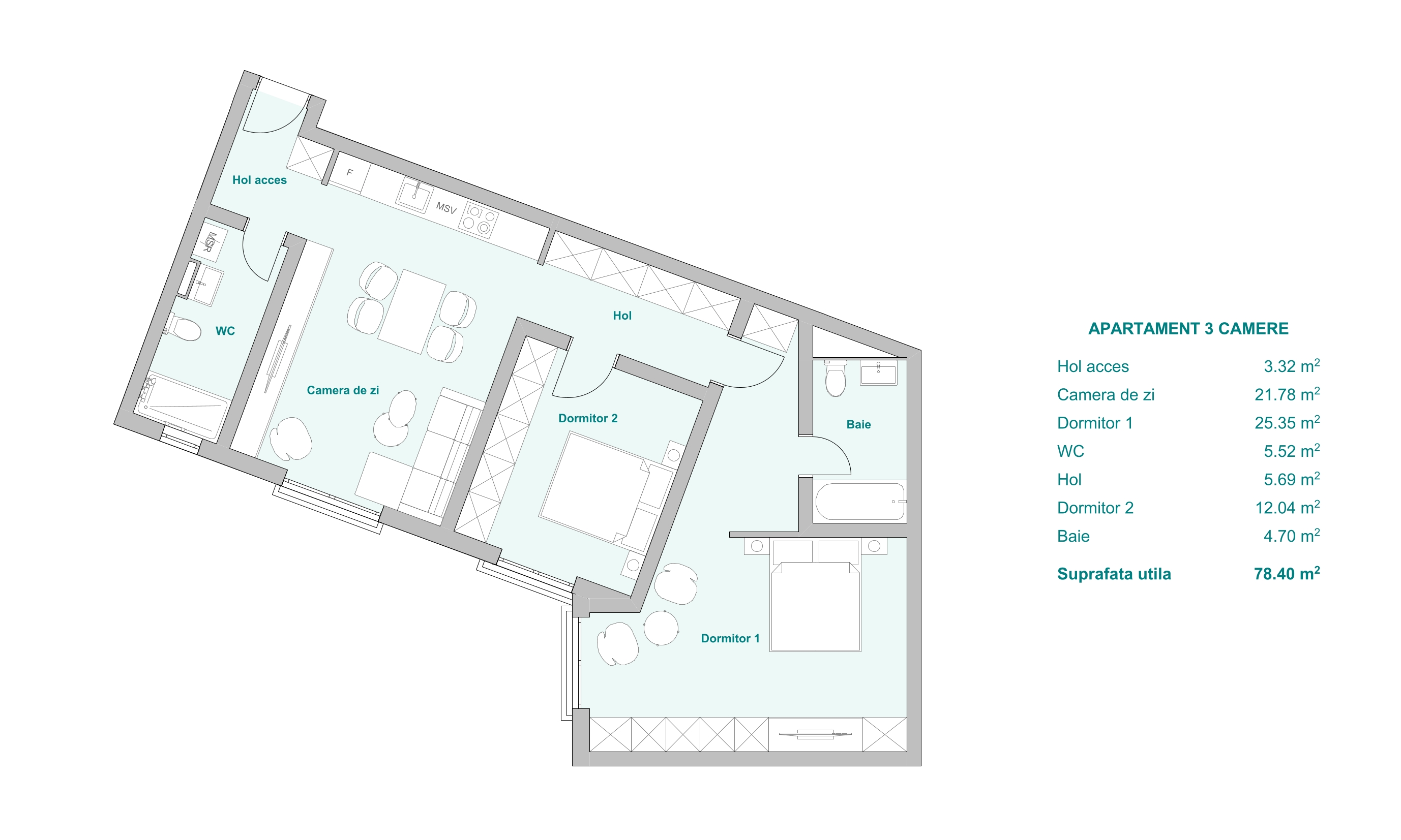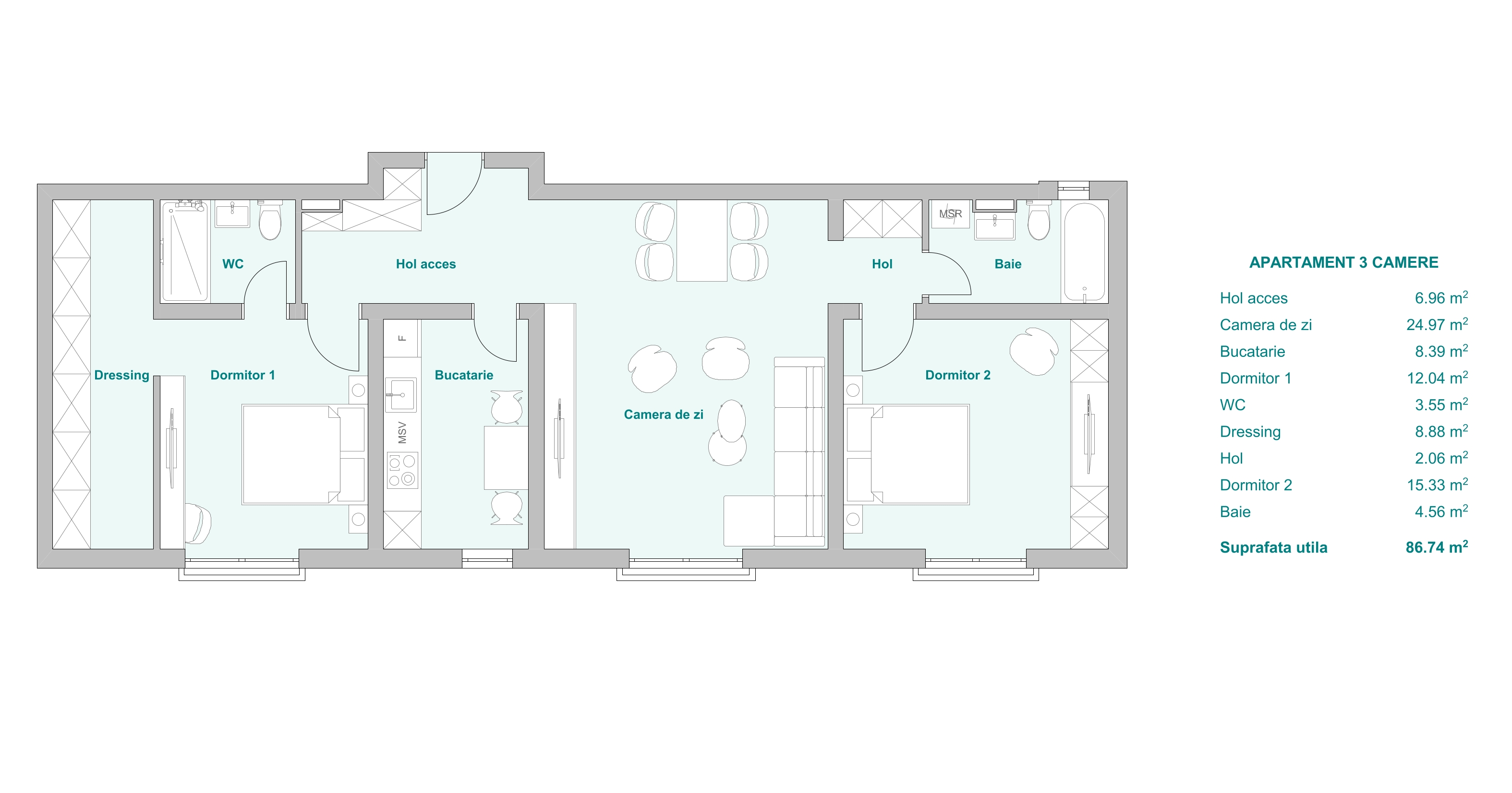 F8 – Apartament 3 camere etaj 2, 88 mp + 150 mp terasă